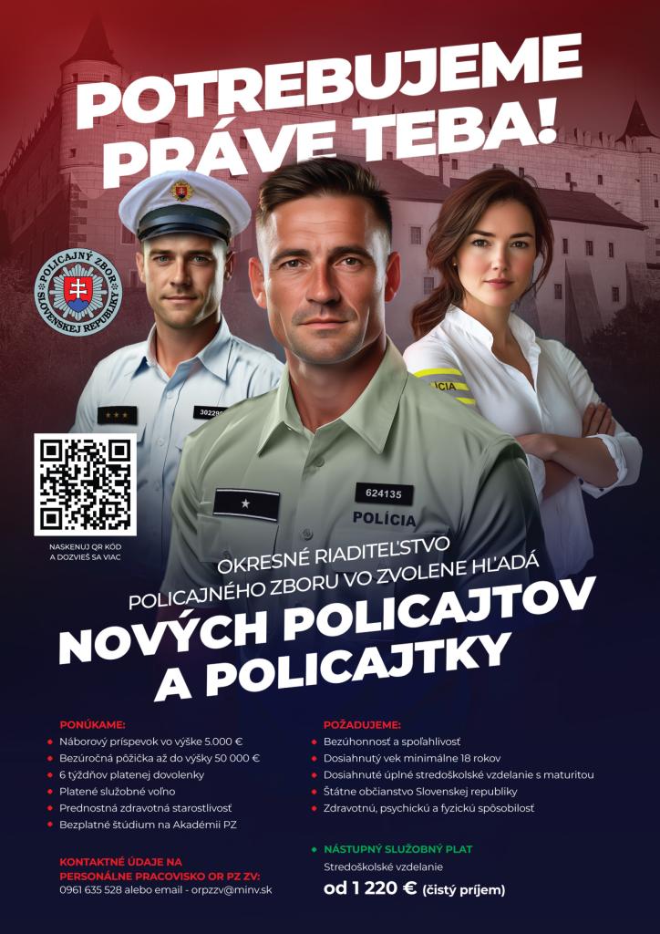 Okresné riaditeľstvo PZ vo Zvolene hľadá svojich nových kolegov a kolegyne.